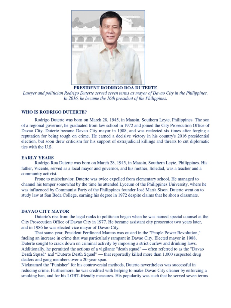 Rodrigo duterte was born on march 28, 1945, in maasin, southern leyte, philippines. This biography touches on his political career. Profile of filipino president rodrigo duterte. That's what i noticed about most populist leaders. He continued this policy as president, earning condemnation from human.